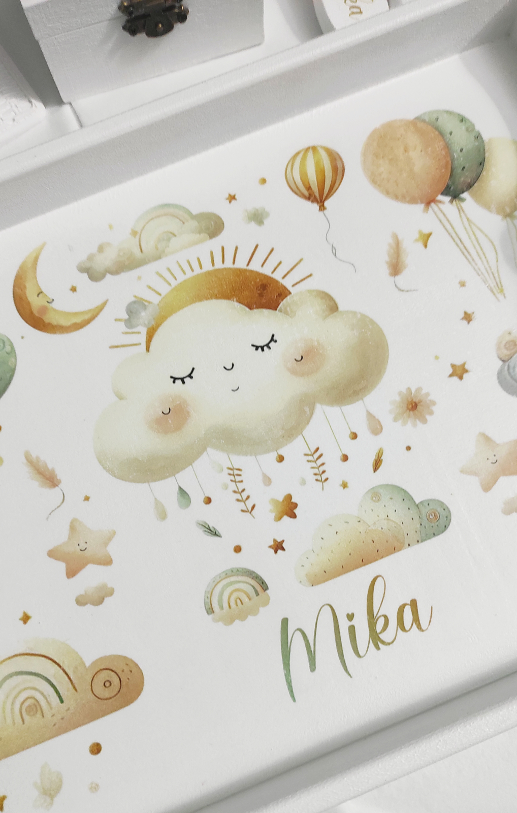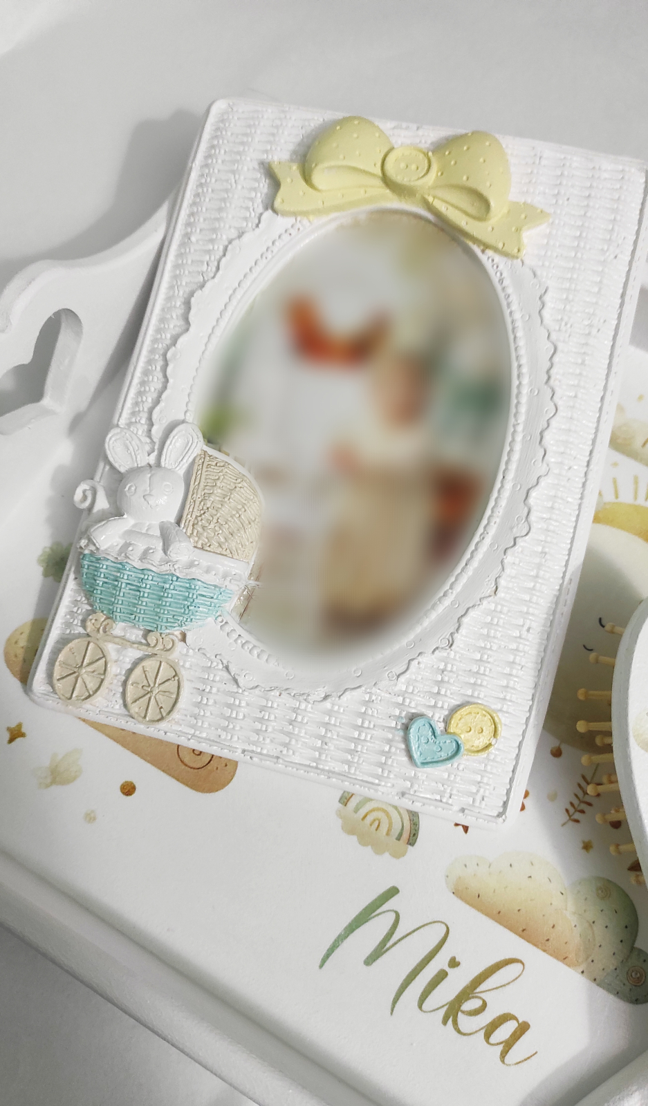 Fiecare set include tavă pentru alegerea obiectelor preferate ale copilului, cutie pentru păstrarea șuviței, oglinjoară, pieptene sau perie din lemn și ramă foto unică. Rama foto este lucrată manual în toate etapele: turnare, finisare, personalizare prin pictură și integrarea fotografiei, urmate de lacuire pentru protecție și durabilitate.
